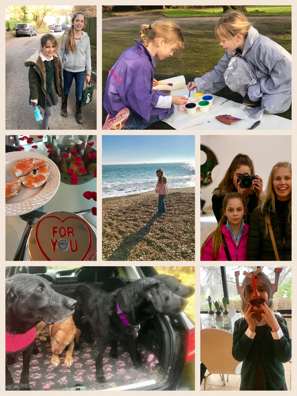 Big sister picking little sister up from school, the Littlest with friend painting outside, Valentine’s Day breakfast for everyone, the Littlest at the beach, with the Tribe at the Tate looking at Yakoi Kusama’s amazing mirror and glass sculpture ‘The Passing Winter’, happy dogs after a very wet walk, the Littlest before school after making her Grand Master Glitch face!