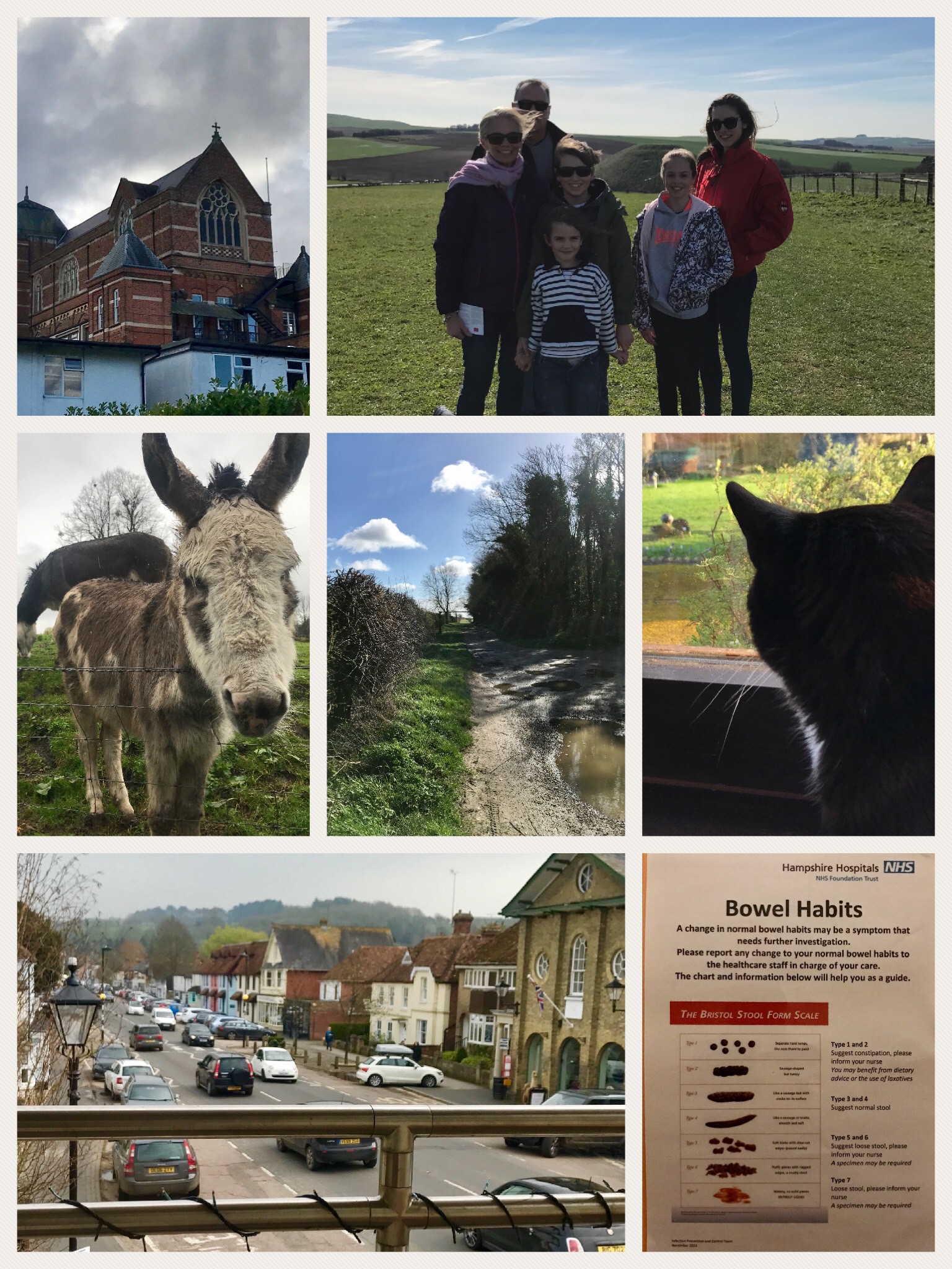 The mishmash of buildings making up Royal Hampshire County Hospital in Winchester, walking the Avebury landscape with Silbury Hill behind us (at the end of a long emotional week), village donkeys Banoffe and Quiche, Danebury pathway, Holly watching our resident ducks, Stockbridge High Street from the Coffee Lab, a poster on the wall of Northbrook Ward – bizarre but it was a pretty scary week and for some reason the poster always brought everything back to basics!