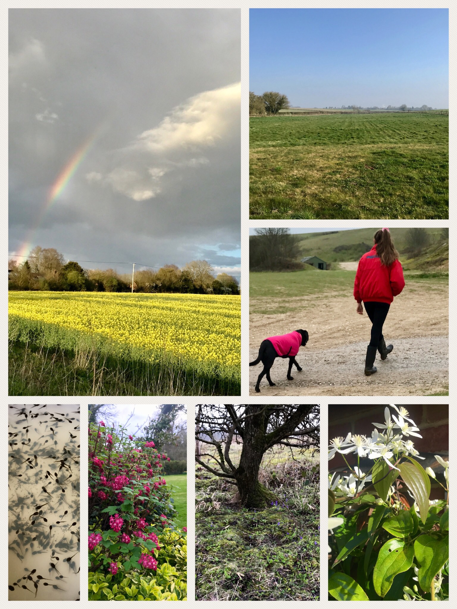 A rainbow over the field of rape just below Bury Hill, early morning across the fields, the Eldest and Molly out for a drier walk than last time, tadpoles!, glorious spring colour in the garden, tiny wild violets below a still naked tree, spring clematis in flower.