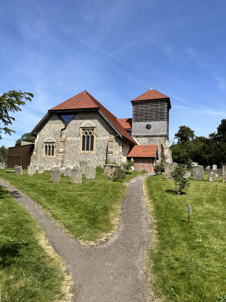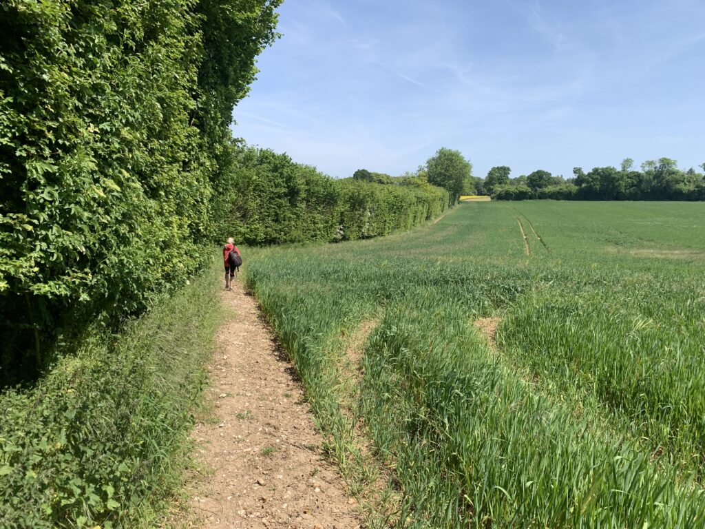 A beautiful late May Day and just three of us head out for this second leg (the others wrapping up their end of year exams at uni) – looking at the photos, it feels like a lifetime ago as the Littlest is most definitely little-er than me (just)! Having parked the car in Alresford, the Pilgrims’ Way takes us past The Cricketers pub, past a muddle of old and new homes and a big solar farm before arriving in Bishop’s Sutton where the Norman Church of St Nicholas sits. It’s known for having refreshments for pilgrims as well as a stamp for the Pilgrims’ Passport.