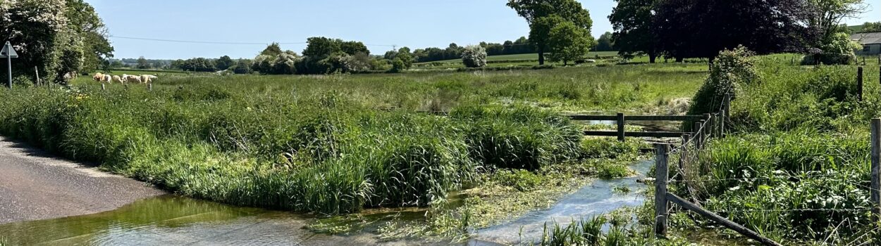 We walk along country roads, across a ford over the River Arle – no one is about and it is glorious countryside. Quintessential Hampshire. As we walk across a field lined with cow parsley, Thomas the Tank Engine’s steam train passes us on The Watercress Line on the ridge above us.