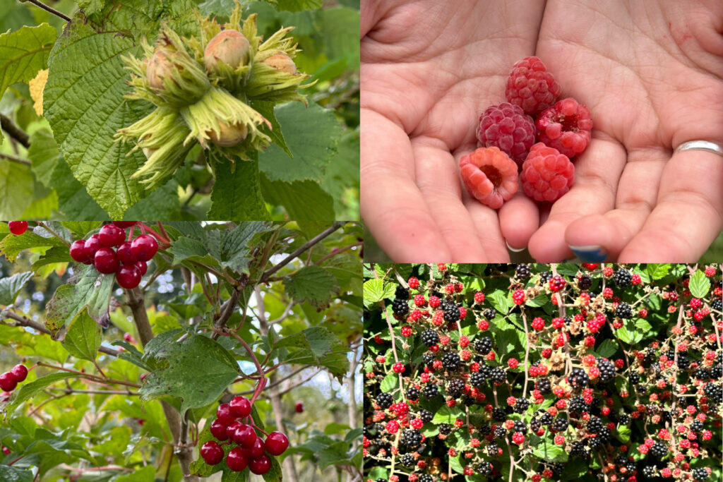 The fields we’re walking through are dusty and caked dry. Brambles chaotically clamber through hedgerows with black berries ripening – some are ready to eat and make good snacks. The Littlest finds an ‘escaped’ raspberry bush laden with perfectly ripe fruit along one stretch. Guelder rose berries gleam red amidst the dense green alongside clusters of cobnuts ripening – a rich bounty for wildlife.