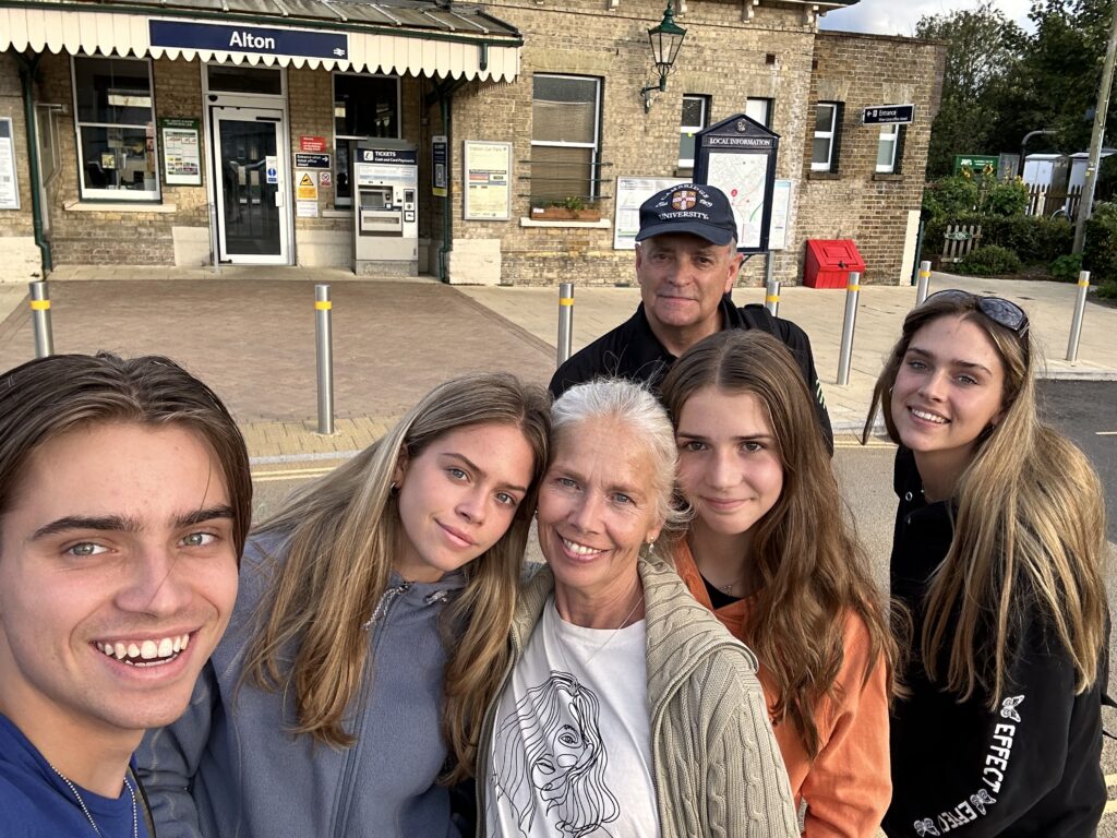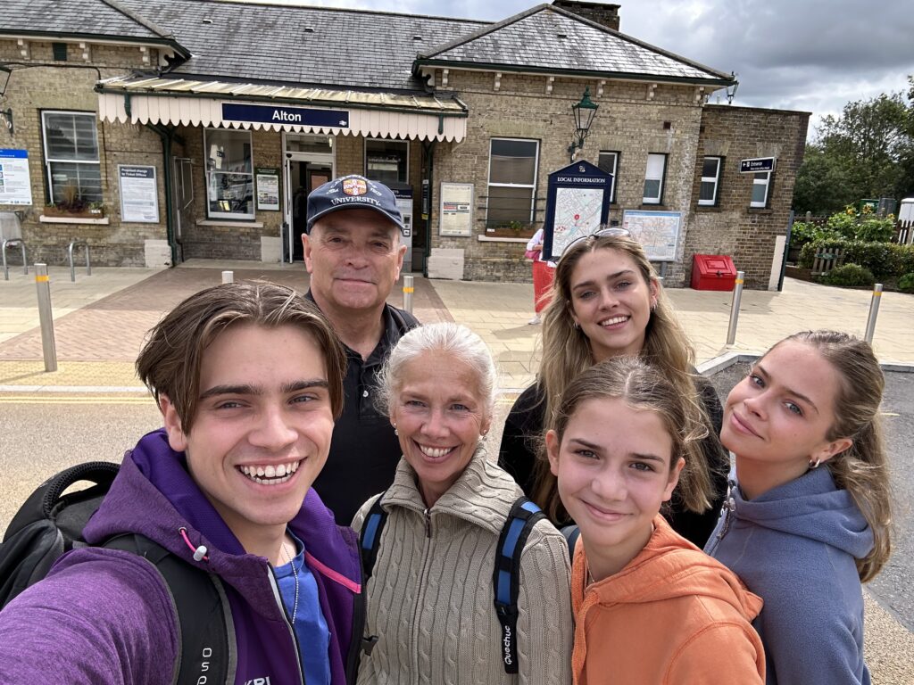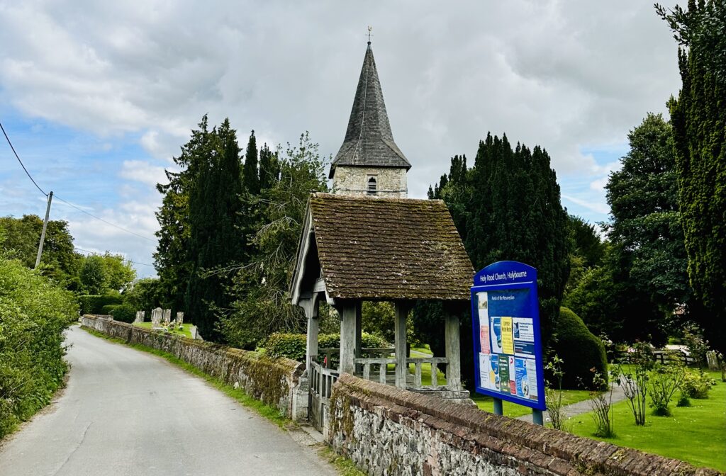 This third leg was pretty special – I finally had the whole Tribe walking together with GD recovered from her surgery. So on a typically British, overcast August bank holiday, we parked the car at Alton station where we’d ended the last leg. A fairly uninspiring start to the walk takes us past garages along roads and Anstey Park’s playing field but soon we arrive in the village of Holybourne and Holy Rood church, a very beautiful building dating back to the 10th Century.