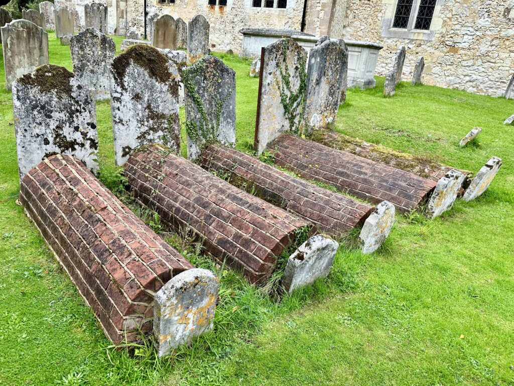 In the graveyard there are some unusual barrel graves made of brick and dating back to the early 18th and 19th Centuries. With a rounded arched top and built above the ground, they were used in marshy areas or under trees where grass wouldn’t grow.