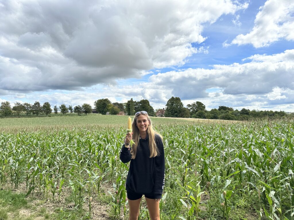 Having stamped our ‘passports’ we find a grassy field to have our lunch before continuing on the path that takes us through a field of maize. The Eldest finds an ear of corn; she strips the husk back to reveal the butter yellow kernels. It returns home with us and has been part of our autumn wreath ever since – an unusual reminder of this leg of the walk!