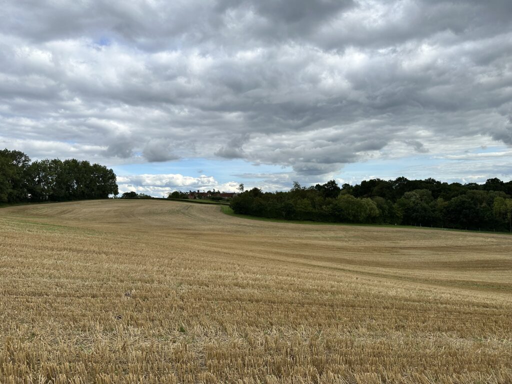 Inside there is an unusual late 12th Century Norman square shaped font cover that is raised and lowered by a pulley system. Having stamped our ‘passports’ again, we return to the route and continue along and across end-of-summer dry and harvested fields, the sun now hidden by low ominously dark clouds.